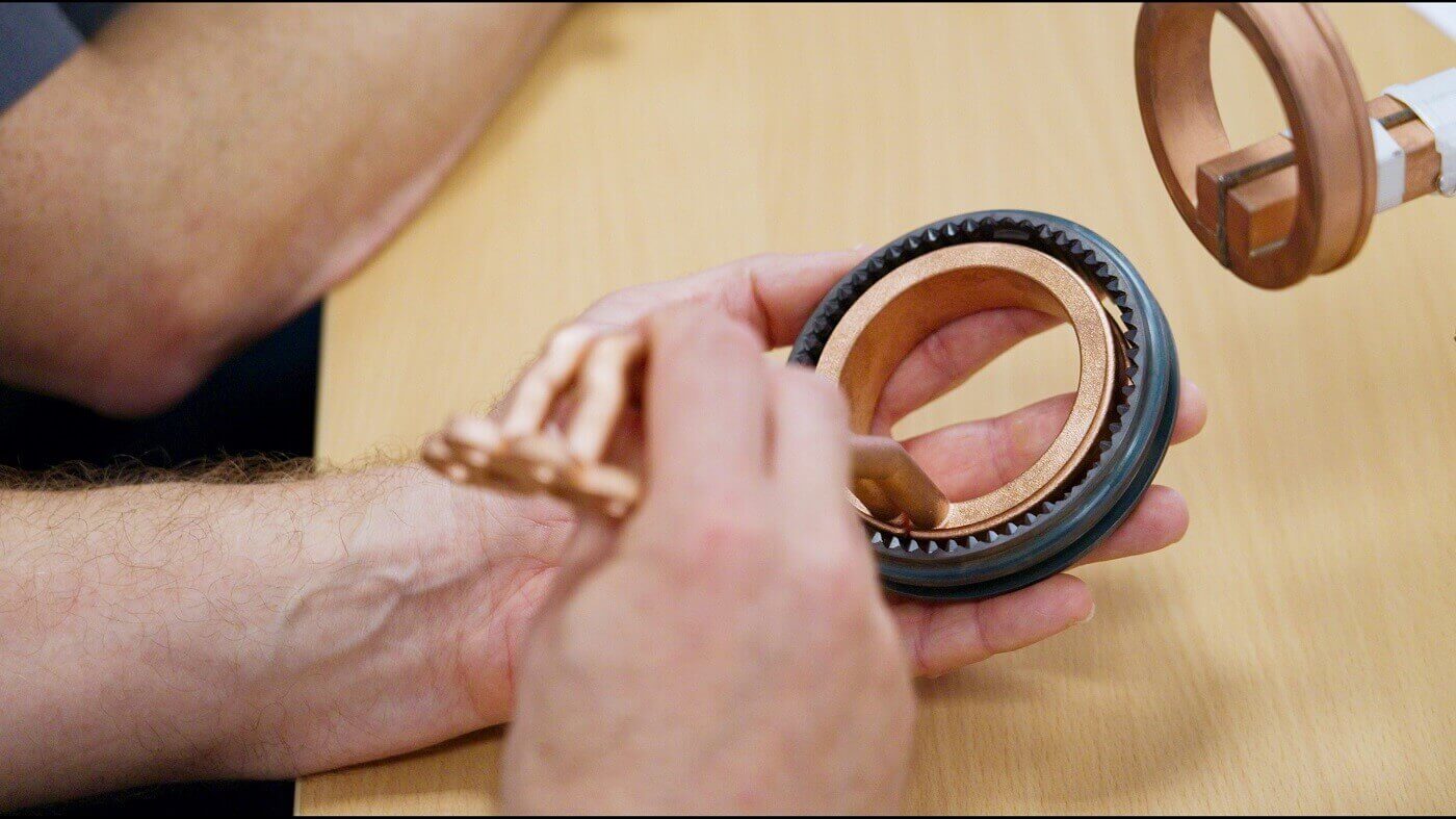Τα κιβώτια ταχυτήτων των μοντέλων Transit είναι εξοπλισμένα με ένα συγχρονιζέ σε σχήμα δακτυλίου, το οποίο συμβάλλει στη διασφάλιση ομαλών και αξιόπιστων αλλαγών. Κατά τη διαδικασία παραγωγής, αυτός το εξάρτημα υποβάλλεται σε μία διαδικασία σκλήρυνσης με τη χρήση ενός εργαλείου επαγωγής, κατά την οποία οι θερμοκρασίες φτάνουν έως και τους 820 βαθμούς Κελσίου.