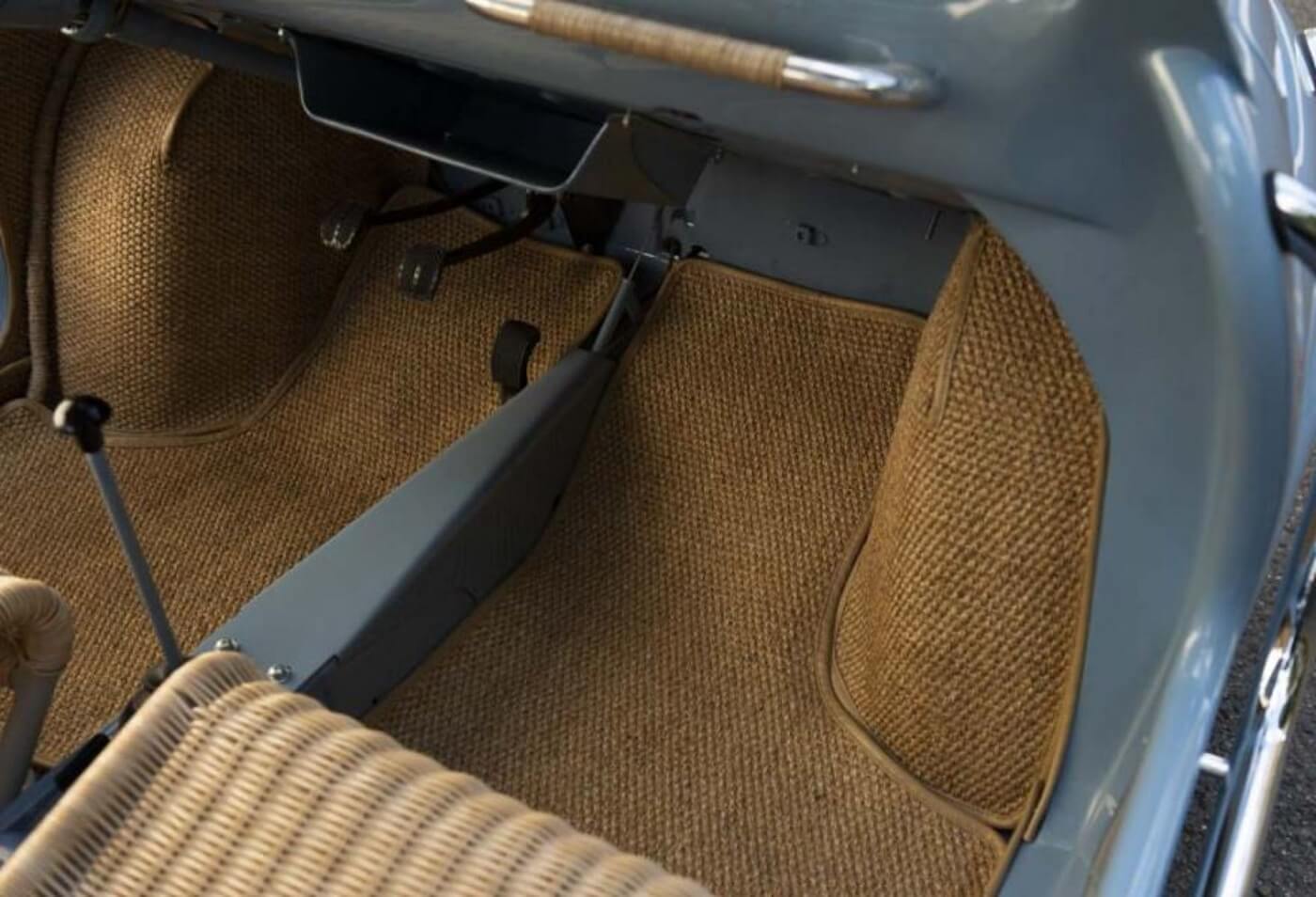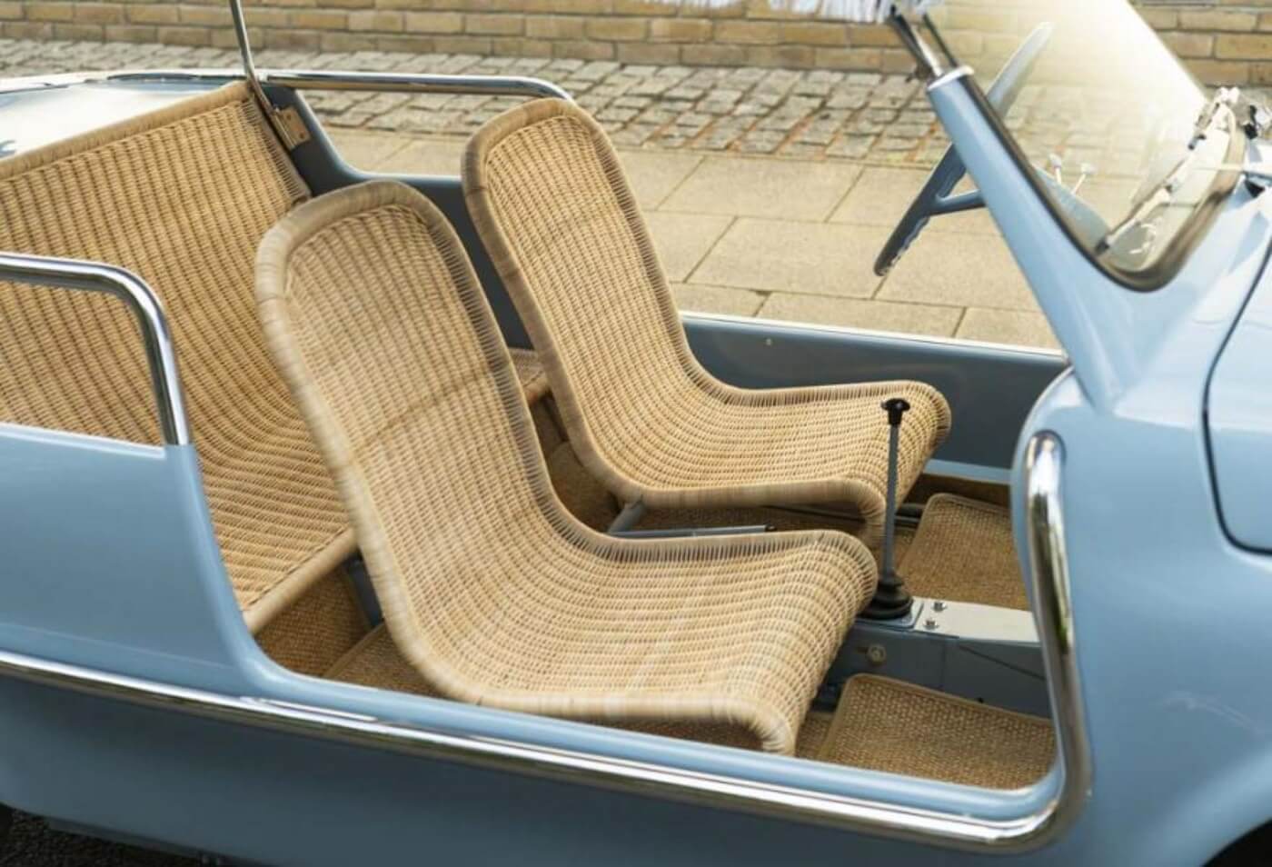 Στο εσωτερικό, το αποκορύφωμα είναι τα χειροποίητα ψάθινα καθίσματα που δε μοιάζουν σε τίποτα με τα συμβατικά καθίσματα αυτοκινήτου. Μπορείτε να καθίσετε πάνω σε αυτά με το βρεγμένο μαγιό σας, χωρίς να φοβάστε ότι θα τα καταστρέψετε, αφού είναι σα ψάθινες καρέκλες καφενείου ή θερινού σινεμά. Αντίστοιχα είναι και τα πατάκια, που στη συγκεκριμένη απόχρωση δε θα αφήσουν να ξεχωρίσει η άμμος που φέρατε από την παραλία. Η όλη ανέμελη προσέγγιση συνεχίζεται στην απουσία συστημάτων ασφαλείας: συγκεκριμένα, το 500 Jolly δε διαθέτει ζώνες ή προσκέφαλα, καθώς η παθητική ασφάλεια κι η προστασία των επιβατών ήταν άγνωστες λέξεις στην αυτοκινητοβιομηχανία στη δεκαετία του ’60.