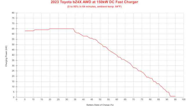 Εμείς δοκιμάσαμε την ικανότητα γρήγορης φόρτισης του bZ4X AWD, στον ανοιξιάτικο καιρό του Los Angeles. Κατά τη διάρκεια μιας νύχτας με θερμοκρασία περιβάλλοντος στους 18 βαθμούς Κελσίου, συνδέσαμε το μικρό (σημείωση ΔΣ: για την αμερικάνικη αγορά) ηλεκτρικό SUV σε έναν φορτιστή DC 150 kW της Electrify America αφού το οδηγήσαμε για περίπου 45′, για να βεβαιωθούμε ότι η μπαταρία δε θα ήταν κρύα. Κατά τη φόρτιση, δεν είδαμε ποτέ τον μέγιστο ρυθμό φόρτισης 100 kW που υπόσχονται οι προδιαγραφές.