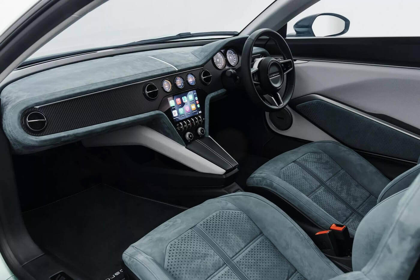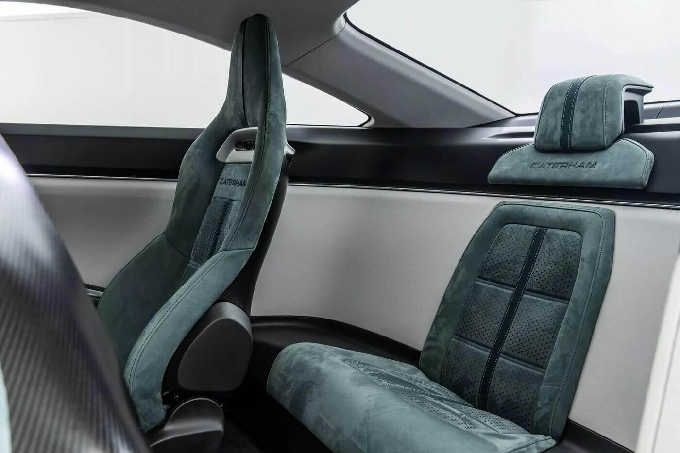 Η Caterham τραβάει τα βλέμματα προσφέροντας διάταξη 2+1 καθισμάτων, κάτι σαν McLaren F1 αλλά στο ανάποδο (εκεί το μονό κάθισμα είναι μπροστά, όχι πίσω) αλλά λέει ότι θα υπάρχει και διάταξη 2+2. Το εσωτερικό είναι αρκετά απλό και μινιμαλιστικό, αλλά δεν ξεχνά ότι ένα σύγχρονο μοντέλο πρέπει να προσφέρει και ψηφιακές ανέσεις. Έτσι, ενσωματώνει μια μεγάλη κεντρική οθόνη αφής και κάμποσες ακόμα ψηφιακές ενδείξεις, καθώς κι έναν πλήρως ψηφιακό πίνακα οργάνων. Η Caterham λέει ότι οι οδηγοί μπορούν να επιλέξουν μεταξύ των λειτουργιών οδήγησης Normal, Sport και Sprint, με το κάθε πρόγραμμα να επιδρά στις επιδόσεις και στο βάρος του τιμονιού.