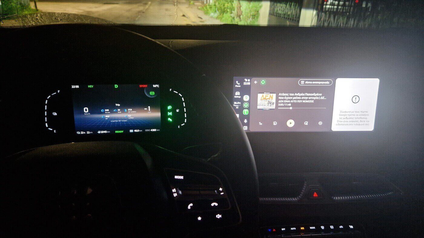 Ναι, αλλά θα κάψω παραπάνω, θα αντιτείνεις. Δε νομίζω κι εξηγώ: στην επιστροφή, η κατανάλωση ήταν στα 9.1 λίτρα. Αφενός γιατί πάλευε μόνη της η βενζίνη. Αφετέρου γιατί όταν βρήκε ευκαιρία, έσπευσε να φορτίσει την μπαταρία για να μην πάθει ξανά τέτοιο κάζο και μείνει μόνο με τον θερμικό. Ενώ λοιπόν στο Αρτεμίσιο είχε πέσει στο 12%, όταν βγήκα από την Αττική Οδό ήταν στο 37%. Είχε δηλαδή σπαταλήσει βενζίνη για να αυξηθεί το ποσοστό φόρτισης. Προφανώς φοβήθηκε μην πάθει ξανά το ίδιο χουνέρι και προνόησε να έχει στρατηγικά αποθέματα. Ιδανικά, δε θα ήθελα να έχει συμβεί αυτό, θα προτιμούσα να φτάσω σπίτι μου με 20% ή και ακόμα χαμηλότερα. Αλλά από τη στιγμή που δεν μπορούσε να αποφύγω την έξτρα φόρτιση, θα ήταν σαφώς καλύτερα να δαπανήσω το ρεύμα για να μην ξεμείνω στις ανηφοριές. Σε φλατ ταξίδι, εικάζω ότι η κατανάλωση θα είναι κάπου στο 8άρι. Κάπου όσο έκαιγε δηλαδή κι όταν το δούλεψα στην καθημερινότητα ξεφόρτιστο.