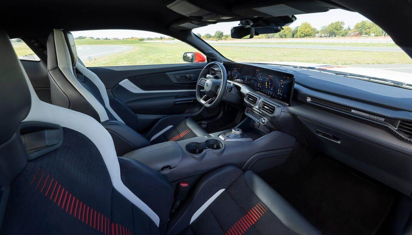 Η Mustang GTD Spirit of America προσφέρει μια ειδική έκδοση καθισμάτων που αναδεικνύει έτι περαιτέρω το μοναδικό εσωτερικό. Αυτά είναι επενδεδυμένα με δέρμα και ένθετα Dinamica. Το Black Onyx ξεχωρίζει, με μια χρωματικά διαβαθμισμένη λωρίδα Race Red στο κέντρο και διακοσμητικά Re-Entry White στο εξωτερικό, ενώ οι ραφές σε χρωματική αντίθεση Victory Blue προσθέτουν μια διακριτική πινελιά. Το χρώμα Victory Blue χρησιμοποιείται επίσης ως στοιχείο αντίθεσης σε όλη την καμπίνα του οχήματος. Τα paddles πίσω από το τιμόνι, ο περιστροφικός επιλογέας ταχυτήτων και το χαρακτηριστικό σήμα είναι κατασκευασμένα μέσω τρισδιάστατης εκτύπωσης από τιτάνιο.
