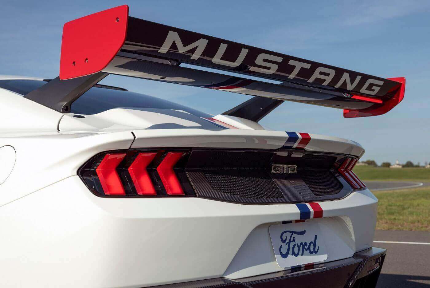 Το γυμνό carbon αποτελεί πρωταρχικό στοιχείο των αεροδυναμικών στοιχείων της Mustang GTD Spirit of America, συμπεριλαμβανομένου του εμπρόσθιου splitter, του διαχύτη αέρα και της πίσω αεροτομής. Αυτή διαθέτει end-plates βαμμένα στο χρώμα Race Red και ένα λογότυπο «MUSTANG» στην κάτω πλευρά, διασφαλίζοντας ότι τα αυτοκίνητα που ακολουθούν δεν θα έχουν καμία αμφιβολία για το τι ήταν αυτό που μόλις πέρασε μπροστά τους. Όλοι οι ιδιοκτήτες μπορούν να επιλέξουν ανάμεσα σε καλύμματα καθρεφτών σε χρώμα Race Red ή γυμνό carbon. Την ίδια στιγμή, οι δαγκάνες των φρένων είναι βαμμένες στάνταρ στο χρώμα Race Red. Επιπρόσθετα, το πακέτο Performance της Mustang GTD προσφέρεται ως στάνταρ εξοπλισμός.