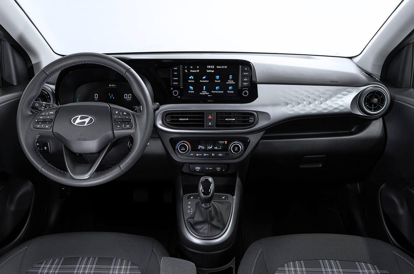 Παράλληλα, το νέο i10 μπορεί να εξοπλιστεί με μπλε ατμοσφαιρικό φωτισμό στα εμπρός καθίσματα. Ένα νέο πακέτο χρωμάτων, Purple Package, προσδίδει μια χαρούμενη αίσθηση στη σπορ εξωτερική σχεδίαση του αυτοκινήτου. Προσφέρει καθίσματα από ύφασμα tartan με κάθετες μωβ γραμμές καθώς και μωβ πινελιές στις ραφές και τους αεραγωγούς. Γκρι επιφάνειες με μωβ αντανακλάσεις, όπως στο ταμπλό και το κάτω μέρος της κεντρικής κονσόλας, προσθέτουν επιπλέον στυλ. Το νέο i10 N Line έχει σχεδιαστικά χαρακτηριστικά εμπνευσμένα από το μηχανοκίνητο αθλητισμό και διαθέτει νέες ζάντες αλουμινίου 16 ιντσών.