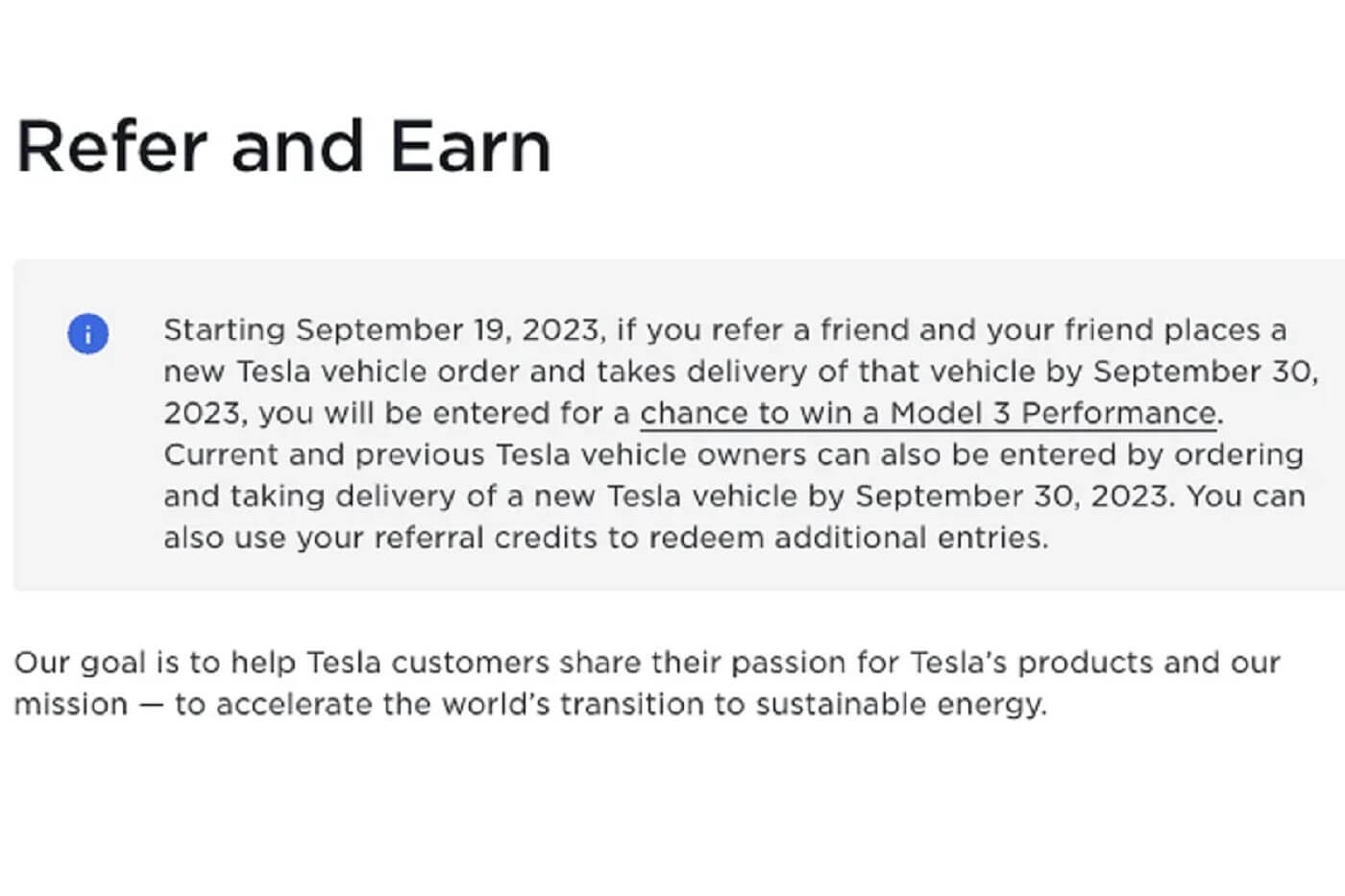Απίστευτο κι όμως αληθινό: αν πείσετε έναν φίλο σας ή συγγενή σας να αγοράσει ένα Tesla, τότε θα μπείτε στην κλήρωση για ένα Model 3 Performance μηδενικών χιλιομέτρων! Η αμερικάνικη εταιρία μάς έχει συνηθίσει σε διάφορα προνόμια μέσω των referral προγραμμάτων της ανά τα χρόνια και τώρα προσπαθεί να προκαλέσει περισσότερες πωλήσεις, προφανώς για να ξεστοκάρει τα παλιά Model 3 ενόψει του νέου μοντέλου. Να ξεκαθαρίσουμε ότι το κίνητρο αφορά την αμερικάνικη κι όχι την ελληνική ή ευρωπαϊκή αγορά κι ότι οι όροι συμμετοχής είναι αρκετά δύσκολοι. Οι υφιστάμενοι ιδιοκτήτες θα πρέπει να ζητήσουν από τους φίλους και την οικογένειά τους να αγοράσουν ένα νέο όχημα Tesla πριν από τις 30 Σεπτεμβρίου 2023 (το εύκολο μέρος της υπόθεσης) κι οι τελευταίοι θα πρέπει να το παραλάβουν πριν τις 30 (ναι, σε μία εβδομάδα από τώρα). Όσοι τα καταφέρουν, θα λάβουν μέρος στην κλήρωση για να κερδίσουν ένα Model 3 Performance.