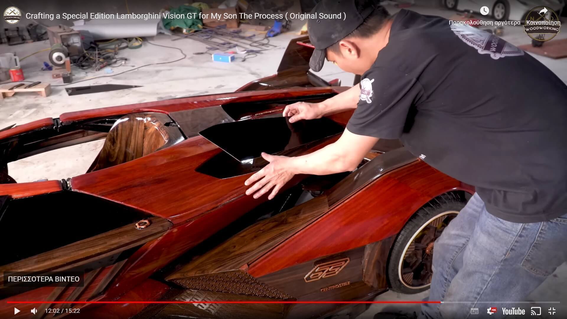 Ωστόσο, αυτό δεν είναι το πιο εντυπωσιακό μέρος της κατασκευής. Γύρω στο τέταρτο λεπτό, ο επιδέξιος μπαμπάς αρχίζει να δημιουργεί τα τμήματα του αμαξώματος από ξύλο κι εξηγεί ότι χρησιμοποιεί μόνο πεσμένα δέντρα και ποτέ δε σκοτώνει ζωντανά δέντρα για να τα χρησιμοποιήσει στις δημιουργίες του. Στα επόμενα περίπου 10 λεπτά, το υπεραυτοκίνητο σε κλίμακα αρχίζει σιγά-σιγά να παίρνει σχήμα και ζωή κι είναι απολύτως εκπληκτικό να βλέπεις πόσο καλά ο μάστορας του ξύλου αντιγράφει τα πάνελ της Lamborghini Vision Gran Turismo. Το τελικό αποτέλεσμα είναι πολύ καλύτερο από οποιαδήποτε αφίσα για supercar είχαμε στον τοίχο μας όταν ήμαστε παιδιά.