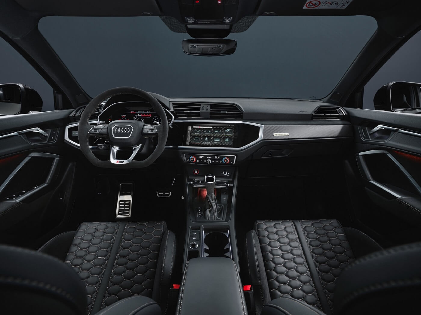 Οι επιβάτες κάθονται στα νέα μπάκετ καθίσματα RS που έχουν δημιουργηθεί αποκλειστικά για αυτή την έκδοση. Τα λογότυπα RS στην πλάτη του καθίσματος είναι εντυπωσιακά. Η επένδυση της πλάτης των καθισμάτων σε ματ Carbon, η οποία χρησιμοποιείται για πρώτη φορά στο RS Q3, είναι ένα ιδιαίτερο σημείο αναφοράς. Τα μπάκετ καθίσματα είναι επενδυμένα με συνδυασμό δέρματος και Dinamica σε μαύρο και jet black χρώμα. Η επένδυση Dinamica διαθέτει μικροϊνες, οι οποίες προέρχονται κατά περίπου 45% από ανακυκλωμένα μπουκάλια PET. Εκτός από τα καθίσματα, το ίδιο υλικό χρησιμοποιείται επίσης και στον πίνακα οργάνων. Οι ραφές σε απόχρωση χαλκού, οι οποίες επαναλαμβάνονται σε όλο το εσωτερικό, δημιουργούν μια ιδιαίτερη αντίθεση. Αυτό ισχύει, για παράδειγμα, για τις κυψελοειδείς ραφές στο κέντρο του καθίσματος, το κεντρικό υποβραχιόνιο, το υποβραχιόνιο των θυρών, το τιμόνι, που διατίθεται είτε σε στρογγυλή έκδοση είτε flat bottom, όπως και για τα μαύρα πατάκια με τα κεντημένα λογότυπα «RS Q3». Η έκδοση «edition 10 years» διαθέτει επίσης διακοσμητικά ένθετα από carbon, όπως το κάλυμμα της πλάτης του καθίσματος σε ματ φινίρισμα. Η οθόνη MMI έχει carbon εμφάνιση, ενώ στην οθόνη αφής 10,1 ιντσών περιλαμβάνεται ο σειριακός αριθμός «1 of 555». Όταν ανοίγουν οι πόρτες, τα φωτιζόμενα διακοσμητικά μαρσπιέ των θυρών προβάλλουν ένα κόκκινο 3D διαμαντένιο μοτίβο στο έδαφος.