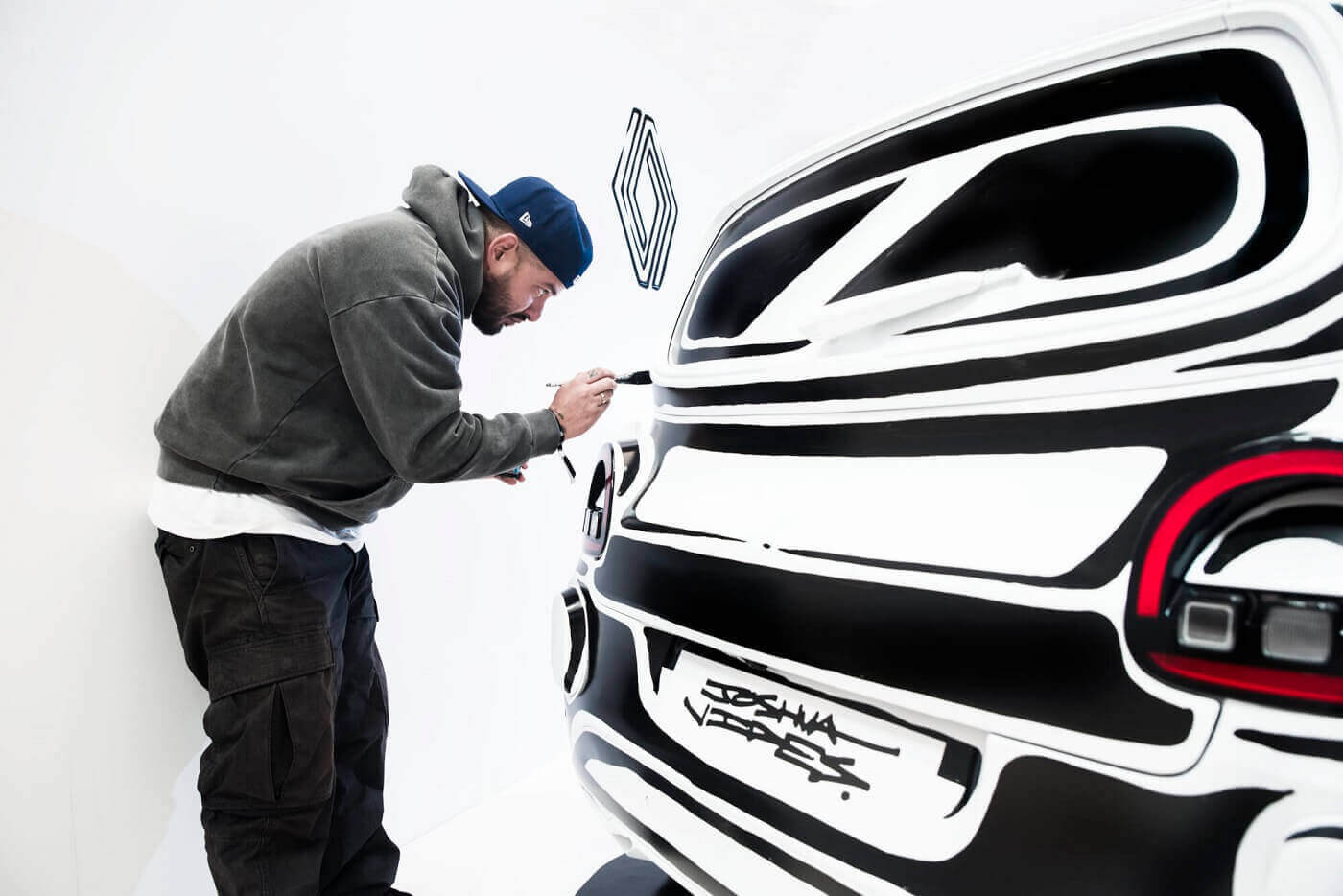 Αυτή τη φορά, η μάρκα έδωσε στον Joshua Vides απόλυτη καλλιτεχνική ελευθερία, για να επανερμηνεύσει το Twingo E-Tech Electric, στο πλαίσιο μιας performance που πραγματοποιήθηκε στο Renault Carwalk. Από τις 8 έως τις 13 Απριλίου, ο Αμερικανός καλλιτέχνης εργάστηκε μπροστά στο κοινό, μεταμορφώνοντας το όχημα και εστιάζοντας αποκλειστικά στο εξωτερικό του.