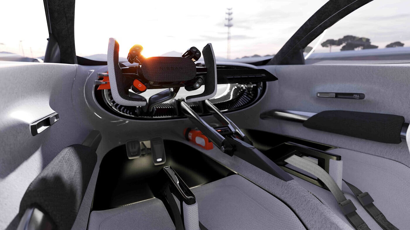 Ανάμεσα στους δύο επιβάτες, δύο μεταλλικοί δοκοί συγκρατούν την κεντρική κονσόλα στη θέση της και βιδώνονται στη «ράχη» του αυτοκινήτου που φαίνεται από το πάτωμα. Κάτω από τις δύο ράβδους στήριξης, είναι τοποθετημένος ένας πυροσβεστήρας. Το εσωτερικό είναι μια φουτουριστική ερμηνεία της γυμνής λειτουργικότητας ενός αγωνιστικού αυτοκινήτου, με μερικές μόνο οθόνες που εμφανίζουν βασικές πληροφορίες με ελάχιστους περισπασμούς οι οποίες παραπέμπουν στις ρυθμίσεις διαδικτυακών προσομοιωτών αγώνων.