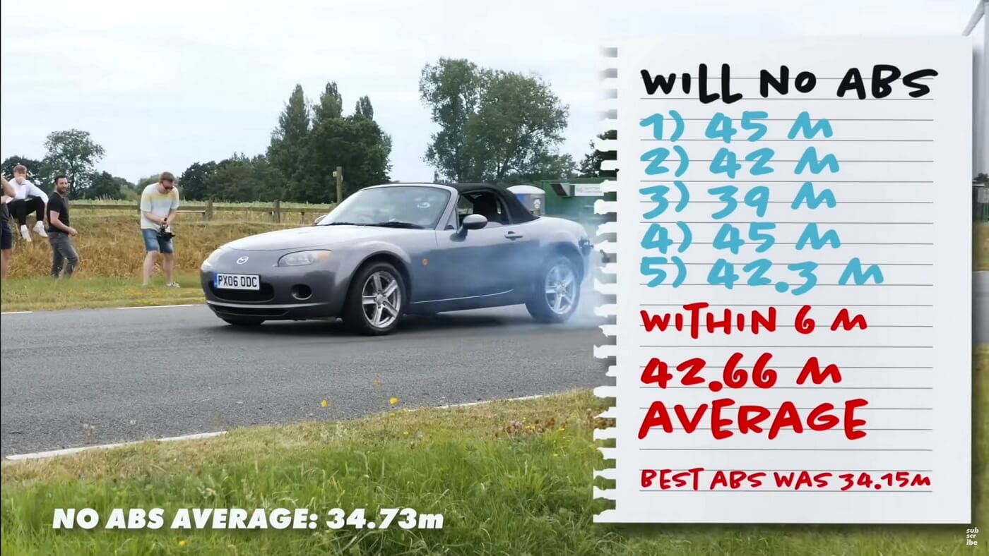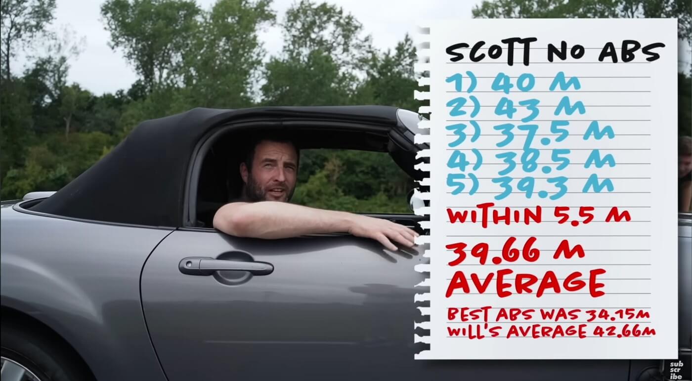 Ο Scott Mansell, επαγγελματίας οδηγός αγώνων κι οικοδεσπότης του καναλιού Driven Media στο YouTube (σωστά θυμάστε, αυτά τα μουρλοκομεία που έχουν ασελγήσει πάνω σε ένα Caterham κι ένα MR2, φορώντας τους σλικ ελαστικά από μονοθέσιο ή οκτώ ζάντες ή τέσσερις ρεζέρβες ανάγκης), προσπάθησε να ανακαλύψει εάν ένας πραγματικά καλός οδηγός θα μπορούσε να ακινητοποιήσει πιο γρήγορα ένα Miata από το ABS του ιαπωνικού μοντέλου.