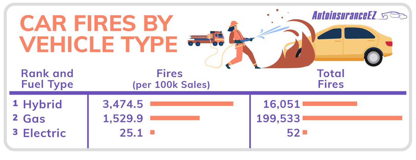 Ανά 100.000 πωλήσεων, η στατιστική αποκαλύπτει ότι πρωταθλητές σε φωτιές είναι τα υβριδικά με 3.474,5 περιπτώσεις, πίσω τους τα μοντέλα βενζίνης με 1.529,9 και τελευταία (δηλαδή ασφαλέστερα) τα ηλεκτρικά με 25,1!