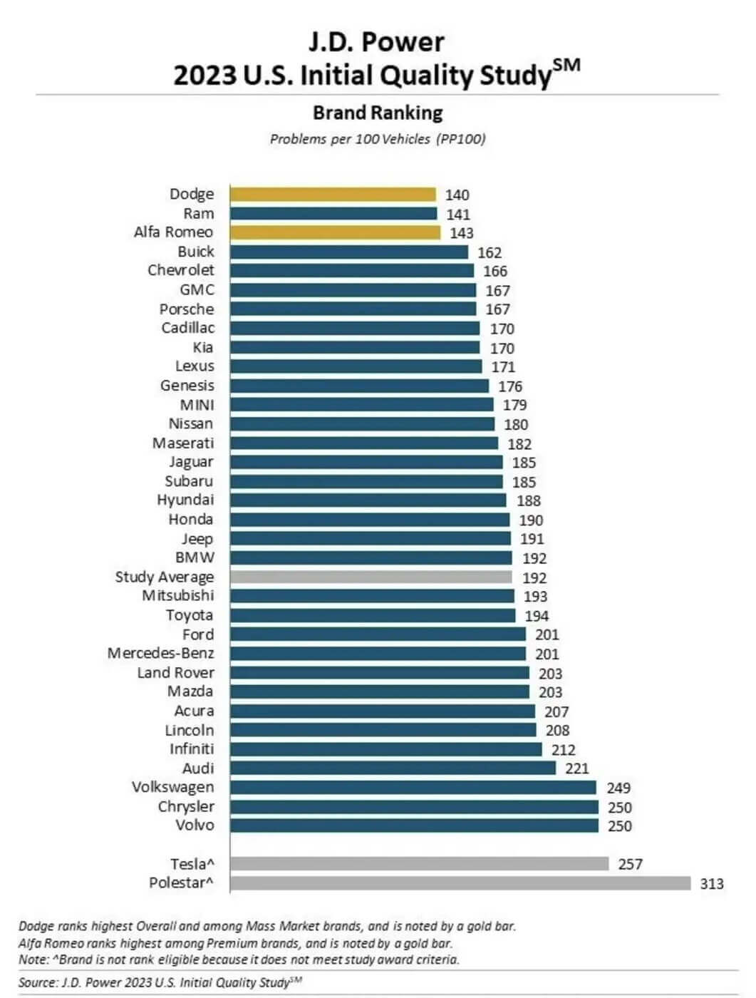 Για αναφορά, παρ’ όλο που η Tesla κι η Polestar επισήμως παραλείπονται από τη μελέτη, οι δύο κατασκευαστές EV είχαν 257 και 313 προβλήματα ανά 100 οχήματα αντίστοιχα. Νούμερο πολύ πάνω από τον μέσο όρο αναφορών και σίγουρα πολύ πάνω από τη Dodge (140) — την κορυφαία αυτοκινητοβιομηχανία στη λίστα φέτος.
