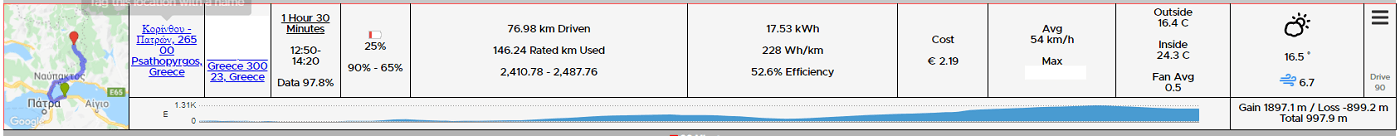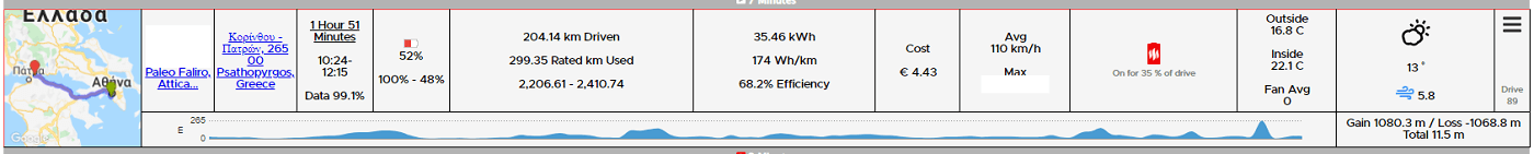 Μιλάμε μαζί του και συμφωνούμε Τρίτη (4/1) πρωί να περάσουμε από την εργασία του, όπως και γίνεται!!! Πλέον είμαστε έτοιμοι για το ταξίδι. Βράδυ Τετάρτης (5/1) προς Πέμπτη (6/1) προγραμματίζουμε το αυτοκίνητο να ολοκληρώσει φόρτιση στο 100% στις 09:00 το πρωί… Τελικά αναχωρούμε στις 10:00 από το Παλαιό Φάληρο. Επιλέγουμε στο αυτοκίνητο ως προορισμό το ξενοδοχείο στην Άνω Χώρα με ενδιάμεσο σταθμό τους ταχυφορτιστές στο ΣΕΑ Ψαθόπυργου και ξεκινάμε. Η απουσία έγνοιας για την αυτονομία έχει ως αποτέλεσμα να απολαύσουμε πλήρως τη διαδρομή. Μόλις μπαίνουμε στον αυτοκινητόδρομο ρυθμίζουμε το Adaptive Cruise Control λίγο πάνω από το όριο, αφήνουμε το πεντάλ του γκαζιού κι απολαμβάνουμε τη διαδρομή. 3-4 φορές που “πέφτουμε” σε συνωστισμό αυτοκινήτων που αραιοκινούνται με παραπλήσιες ταχύτητες και στις τρεις λωρίδες, ένα απλό πάτημα του γκαζιού είναι αρκετό για να εκτιναχθούμε σε απαγορευτικές ταχύτητες και να ξεμπλοκάρουμε. Κάπως έτσι μία ώρα και πενήντα ένα λεπτά αρκούν για να διανύσουμε τα 204km που χωρίζουν το σπίτι μας από το ΣΕΑ Ψαθοπύργου (μέση ταχύτητα 110χαώ) καταναλώνοντας 35.4KWh (17.4KWh/100km).