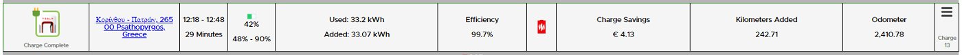 Στο ΣΕΑ Ψαθόπυργου κατευθυνόμαστε απευθείας στους Tesla ταχυφορτιστές, όπου τρεις από τις τέσσερις θέσεις είναι ελεύθερες. Μόνο ένα Tesla φορτίζει εκείνη τη στιγμή. Κατεβαίνουμε για ξεμούδιασμα και παράλληλα “κουμπώνουμε” το αυτοκίνητο στον ταχυφορτιστή. Λίγο να φάει ο μικρός και να πιει νερό, λίγο μια επίσκεψη στην τουαλέτα, σε 29′ φορτίζουμε από το 48% στο 90% (με μηδενικό κόστος προς το παρόν!!!). 42% μιας μπαταρίας με ωφέλιμη χωρητικότητα περίπου 80KWh αντιστοιχούν σε περίπου 33,5KWh, δηλαδή μέση ισχύ περίπου 70KW. Αν και μεγαλύτερη από οποιονδήποτε μη-Tesla DC φορτιστή στην Ελλάδα, ικανοποιητική δεν τη λες, δεδομένου και του preconditioning της μπαταρίας κατά την οδήγηση… Σίγουρα μια φόρτιση μέχρι το 80%, πόσο μάλλον με αρχή κοντά στο 20%, θα γινόταν με μεγαλύτερη μέση ισχύ.
