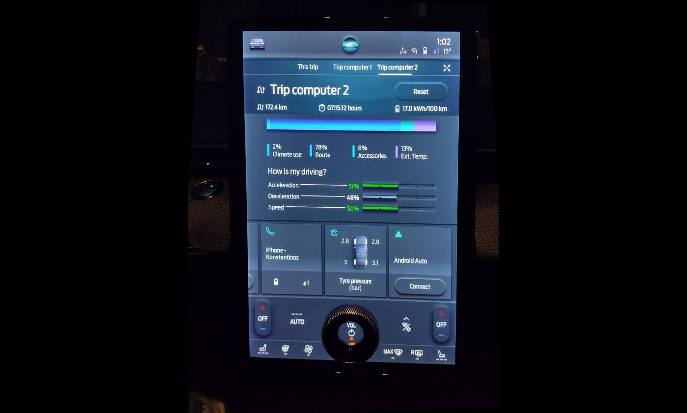 Για το σύνολο των 1.272 χιλιομέτρων που διένυσα, βγαίνει τελικό κόστος 4.76 €/100 χλμ. Αν οι δωρεάν φορτίσεις είχαν γίνει με οικιακή φόρτιση, το ταξίδι θα κόστιζε 6-8 €/100 χλμ. Ενώ αν ήταν εξ’ ολοκλήρου σε επί πληρωμή δημόσιους σταθμούς, θα στοίχιζε 8-9 €/100 χλμ. Κι εδώ να θυμίσω ότι μιλάμε για ένα SUV 4.7 μέτρων και 290 ίππων.